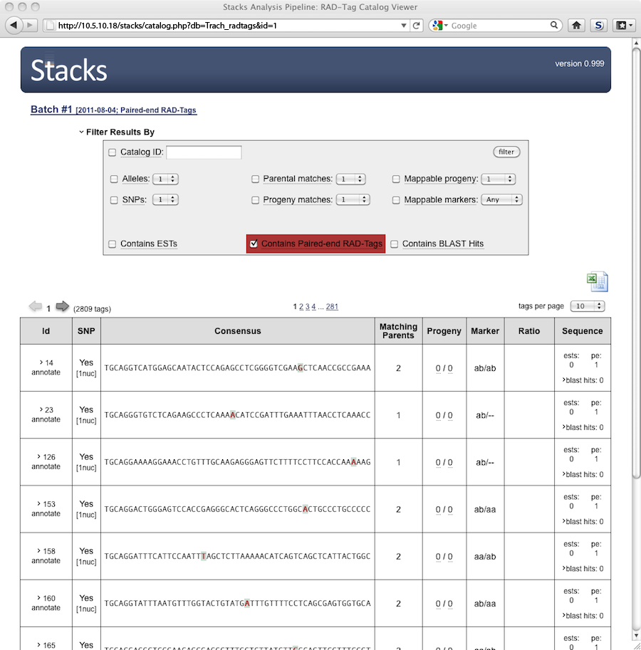 Run Stacks export.pl - identify stacks with SNPs for future step of paired-end matching.