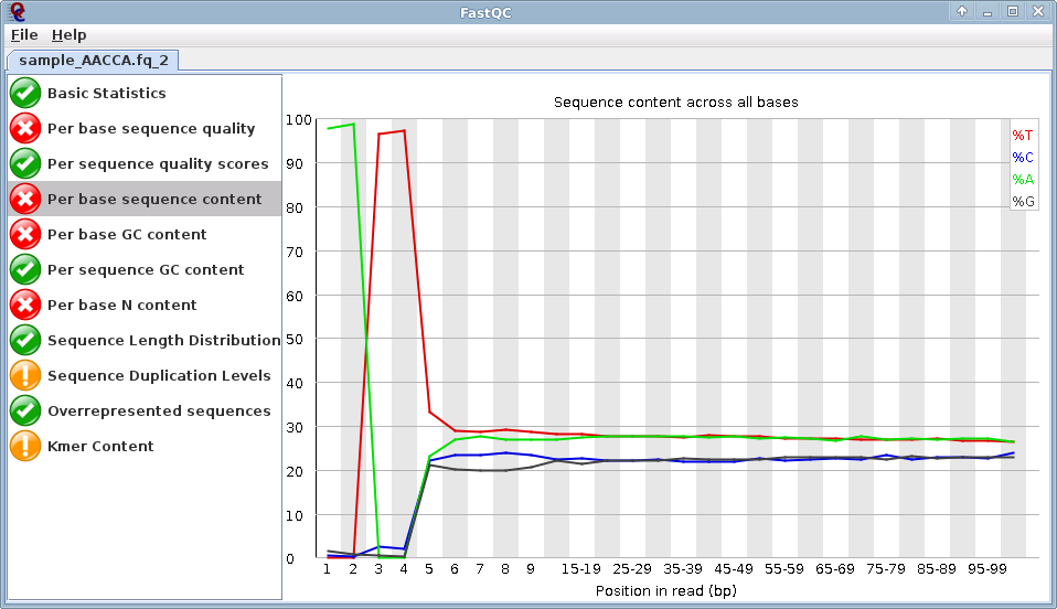 Note the "AATT" biases at the beginning of the read: All reverse reads will have this at the beginning. This is the mluCI Restriction endonuclease overhang sequence.